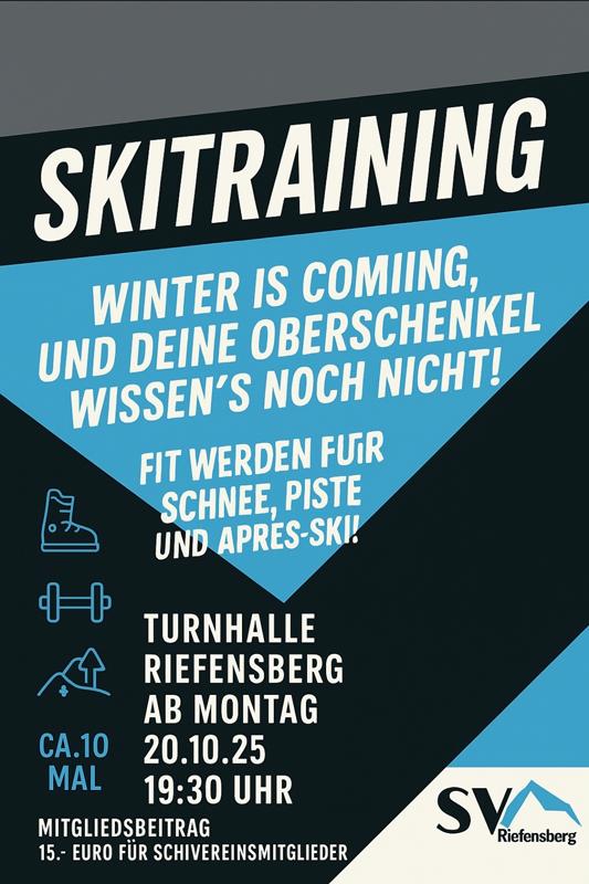 Ab Montag, dem 20.10.2025, um 19:30 Uhr beginnt unsere Skigymnastik wieder! Jeden Montag bieten wir 1,5 Stunden Fitness, bis Weihnachten.